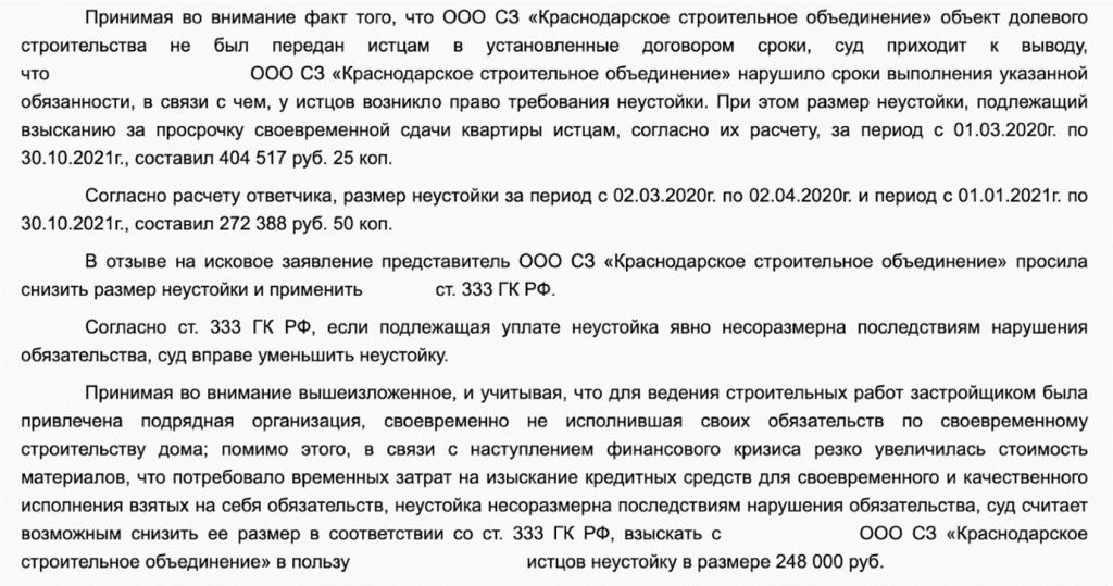 Дольщики направили застройщику претензию, однако требования добровольно удовлетворены не были. Суд подтвердил факт нарушения срока передачи объекта и взыскал с застройщика неустойку, компенсацию морального вреда, штраф за отказ добровольно удовлетворить требования потребителя и судебные расходы. Общая сумма взыскания составила 377 966 рублей. При этом суд снизил размер неустойки по статье 333 ГК РФ, приняв во внимание, что для выполнения строительных работ застройщиком была привлечена подрядная организация, своевременно не исполнившая свои обязательства. Кроме того, суд учел резкое увеличение стоимости строительных материалов в период финансового кризиса, что потребовало от застройщика дополнительных временных затрат на привлечение кредитных средств.